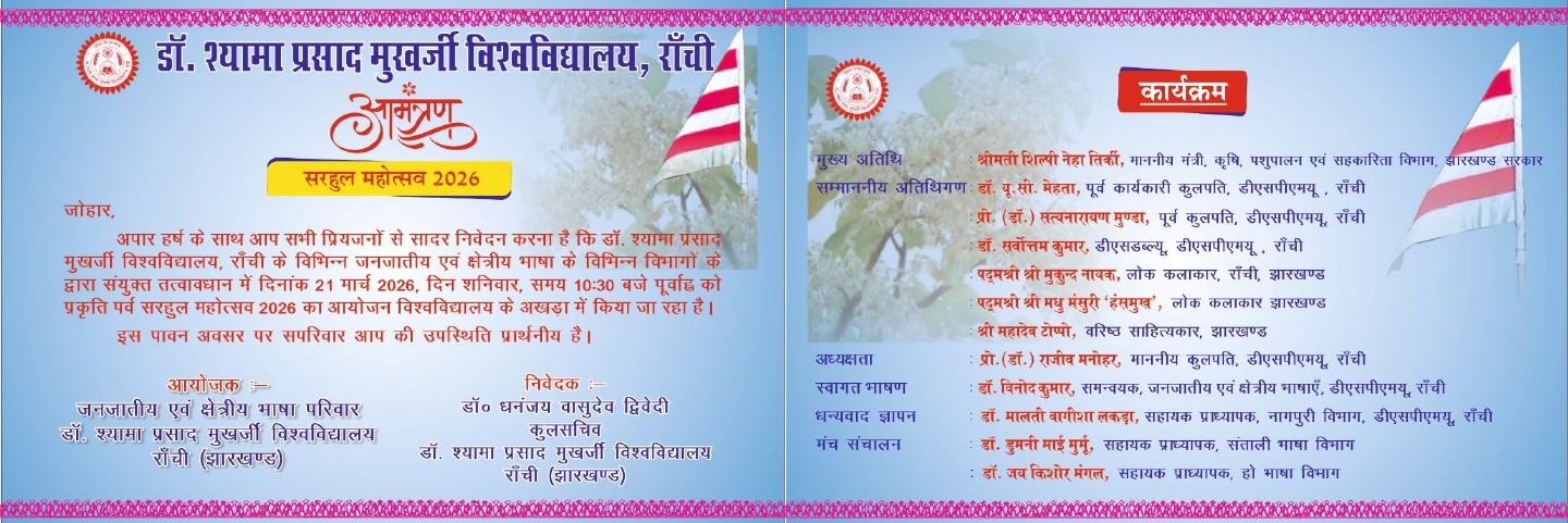 Situated on the tropic of cancer, at an altitude of 651m from sea level amidst tropical flora and fauna, Ranchi College, Ranchi (now upgraded as a Unitary State University and known as Dr. Shyama Prasad Mukherjee University, Ranchi) had been established during the Pre- Independent India. Established in 1926 as a Government Intermediate College, it marched ahead and began Under-Graduate and post–graduate Courses in various subjects of Arts/Science in the year 1946.